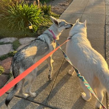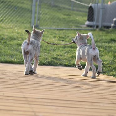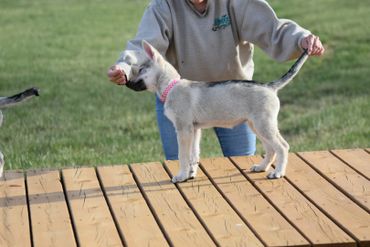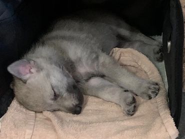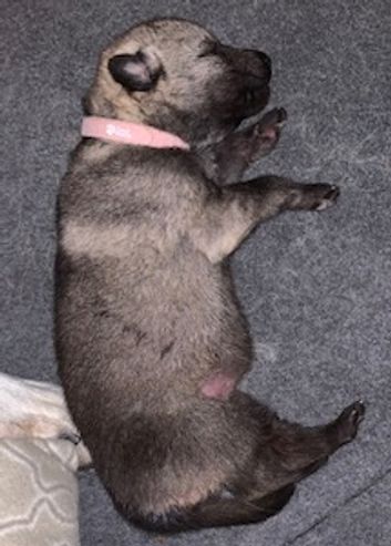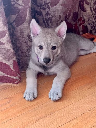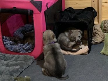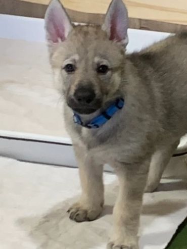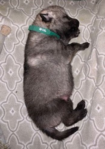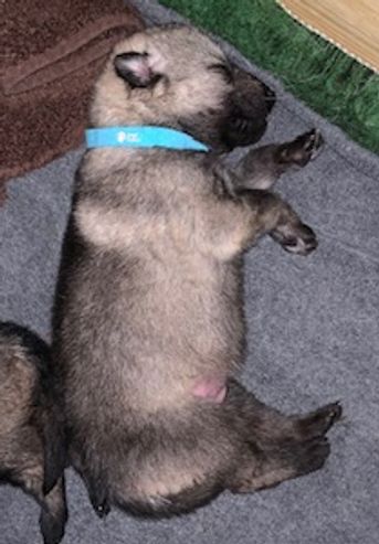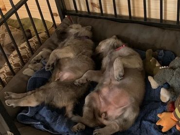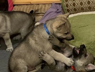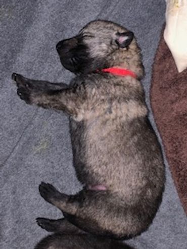 Four little pups were born on January 29, 2024. All very healthy, active and moving around upon arrival. Blue pup was born first followed by Purple (now Green ) then Red and last but not least our only little girl Pink. These pups have a beautiful silver coat with Reds coat containing a little more yellow but beautiful color. All are rambunctious and outgoing but all are sweet and love attention. Red and Blue are quite large at the moment with Green and Pink a little smaller but not to be outdone.